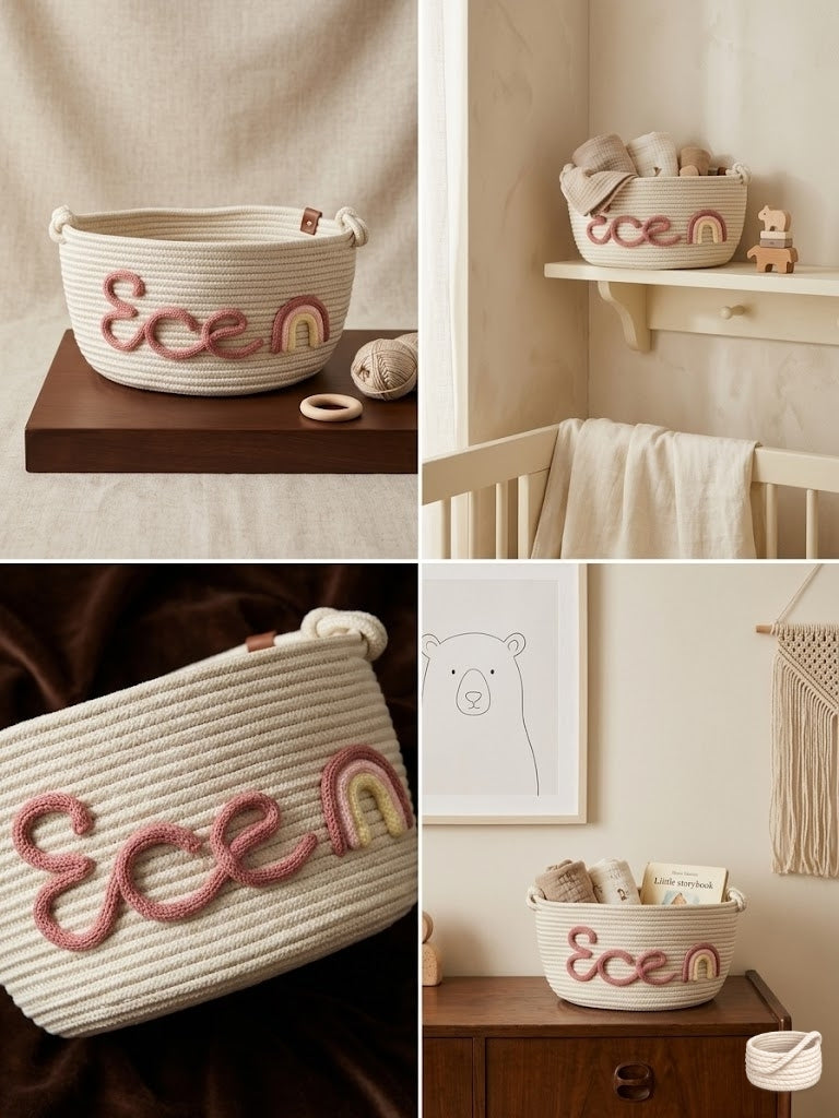 İsme özel hazırlanan Novela sepetleri, çocuk odaları için şık ve kullanışlı bir organizer çözümüdür.