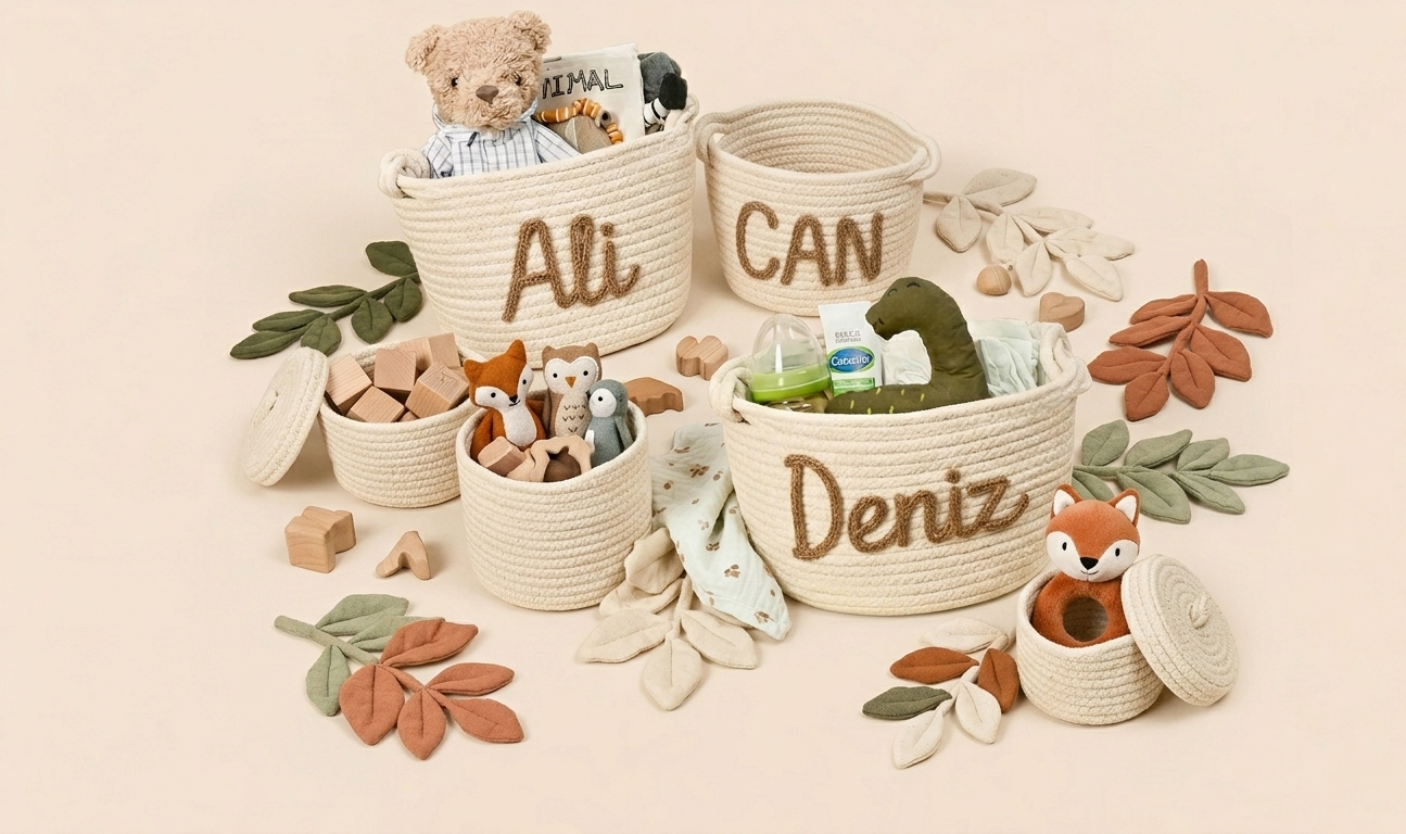 İsim yazımı pamuk ip ile uygulanır. Sepetler hediye ve düzenleme amaçlı kullanıma uygun şekilde özenle hazırlanır.